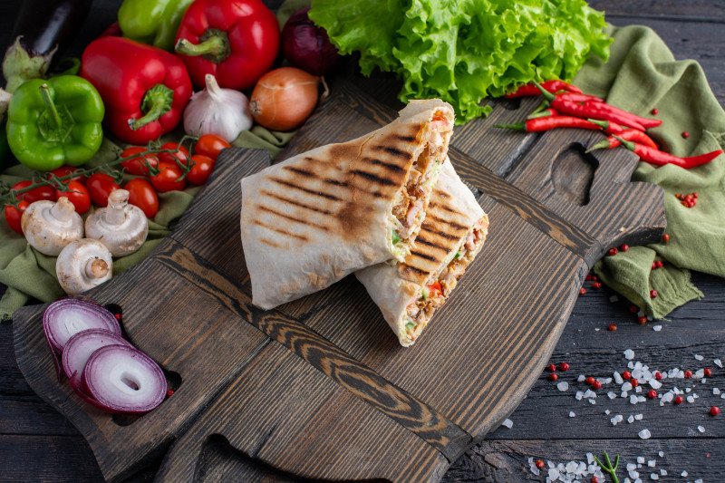 Состав: лаваш, фирменный соус, острый соус, курица на мангале, картофель гриль, маринованные огрурчики, лук зеленый. Выход: 560 гр.